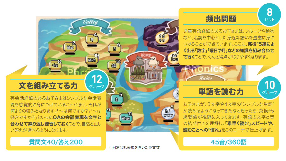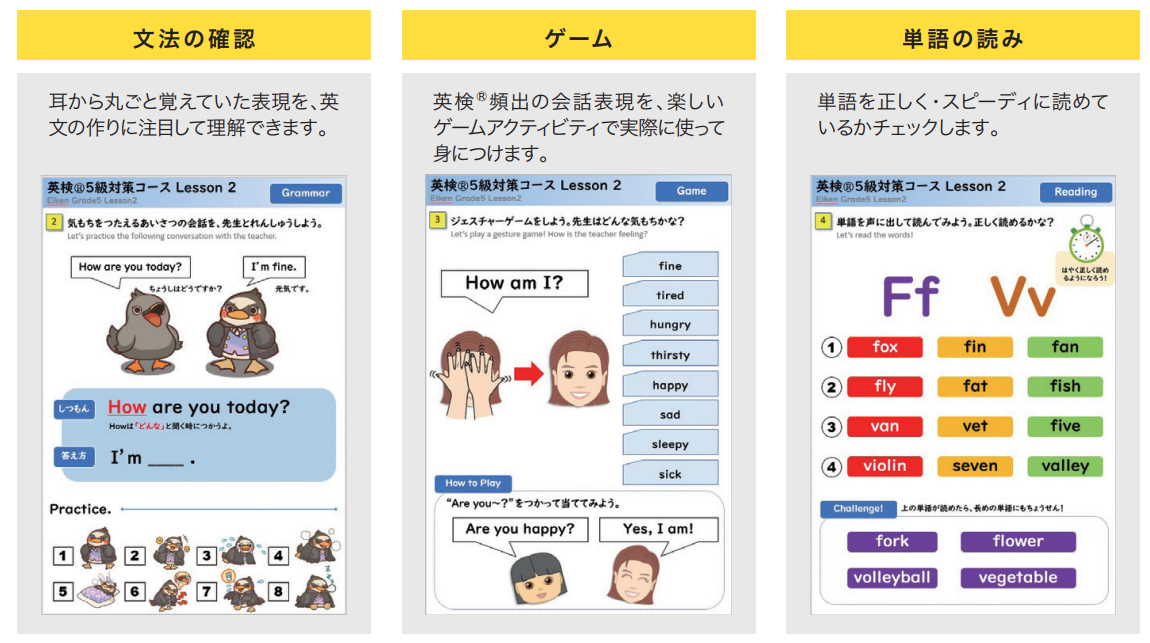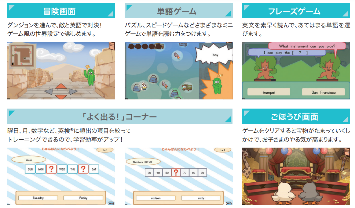 タブレットアプリは、5級頻出の単語と文で構成されており、さらに「文字」と「音」のセットで英検®対策ができる、ゲーム感覚で楽しく学べる画期的な内容となっています。