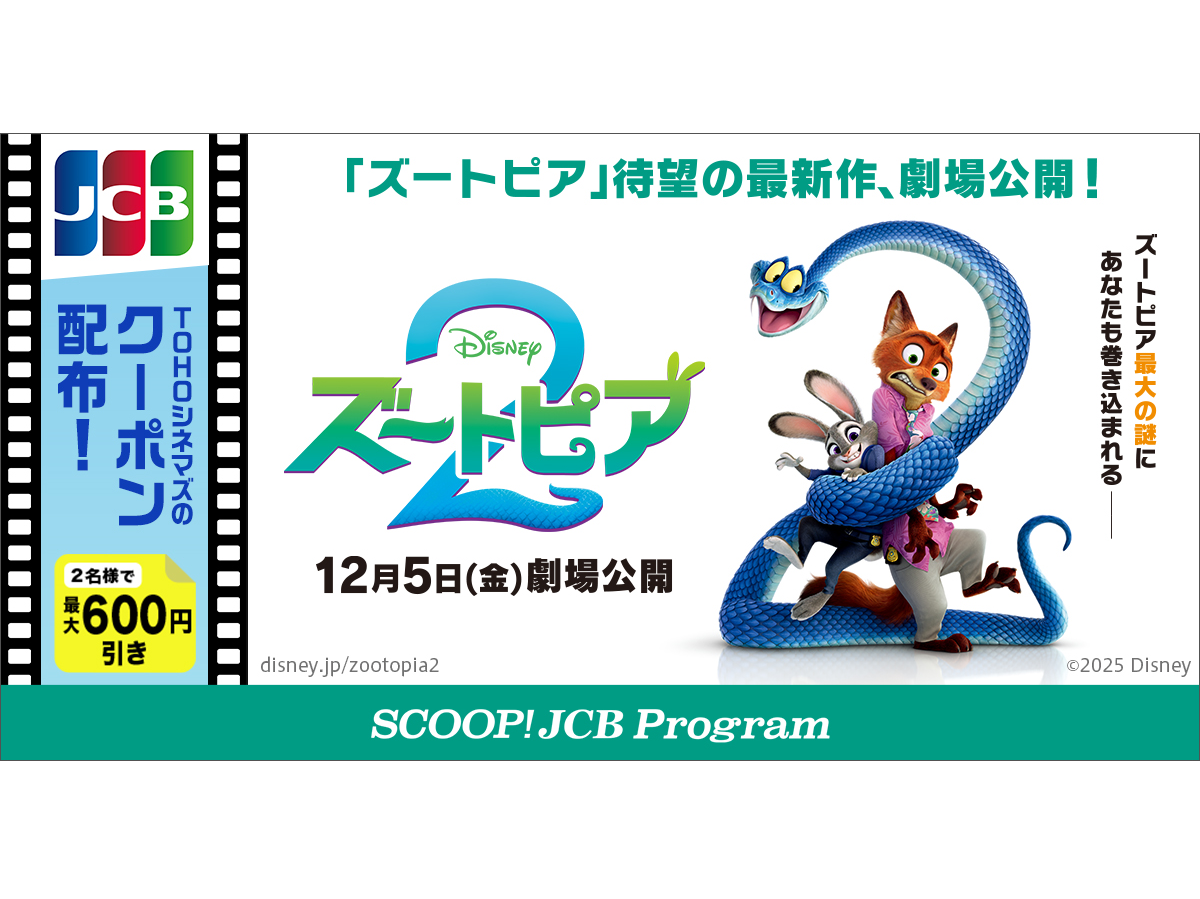 株式会社ジェーシービー(本社:東京都港区、代表取締役会長 兼 執行役員社長:二重 孝好、以下:JCB)は、TOHOシネマズ株式会社(本社:東京都千代田区、代表取締役社長:池田 隆之、以下:TOHOシネマズ)と、12月5日(金)のディズニー映画最新作『ズートピア2』の公開を記念して、本作をお得に鑑賞いただけるクーポンを配布します。