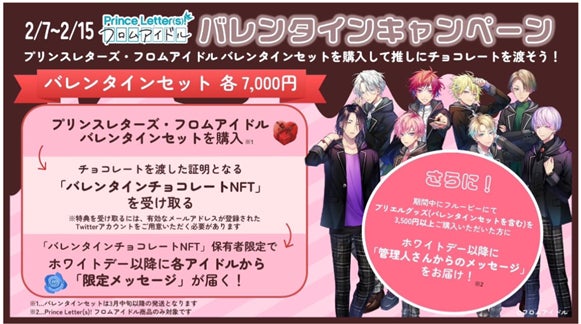 松竹のプリンスレターズバレンタインデーチョコレートNFT配布は、同社が展開する『Prince Letter(s)! フロムアイドル』のバレンタインキャンペーン中に商品を購入したユーザーに対して、好きなアイドルにデジタルバレンタインチョコレートを贈った記念をNFTとして提供するサービスです。また、同NFT保有者は、ホワイトデーである3月14日以降にそのアイドルからのメッセージを含むデジタルコンテンツを限定で閲覧できるユーティリティがサードパーティーにより提供される予定です。
