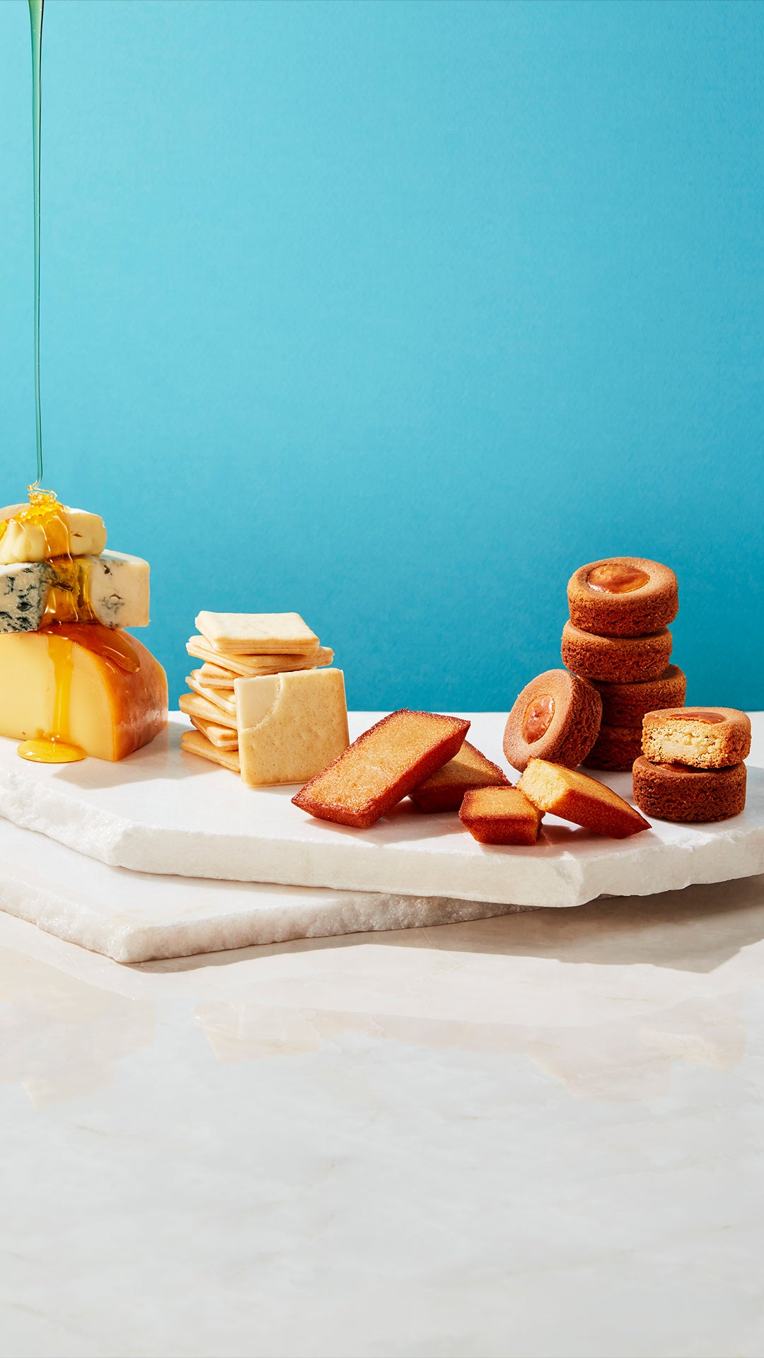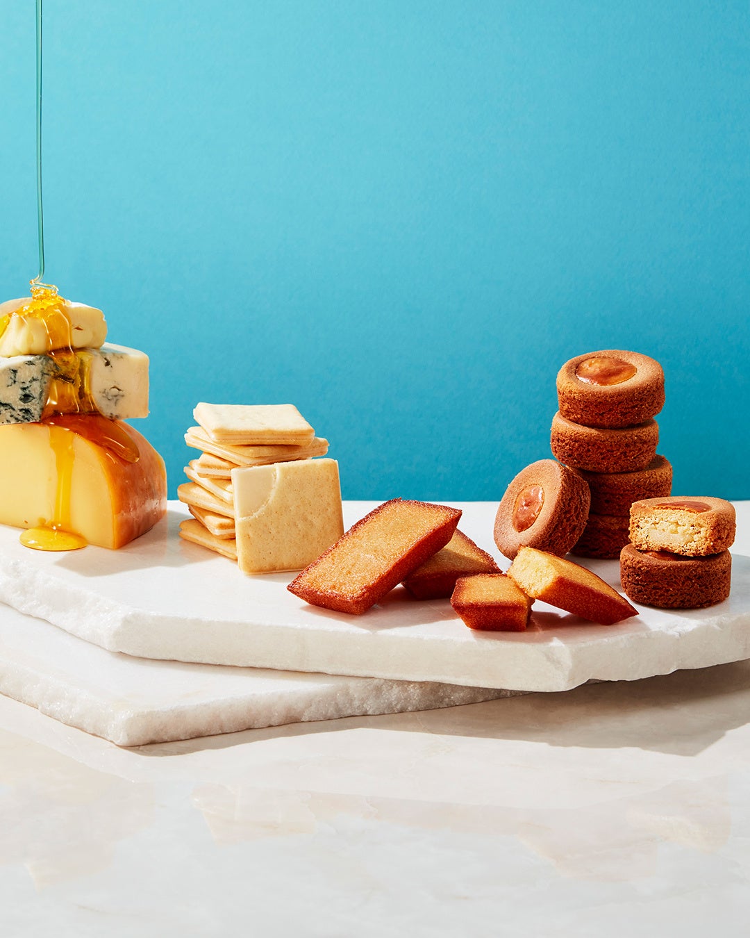 コクのあるゴルゴンゾーラと相性抜群の蜂蜜で仕上げた「フィナンシェ」、クリーミーなカマンベールチョコレートを、相性抜群の蜂蜜と北海道牛乳を練り込んだ生地でサンドした「クッキー」、まろやかな味わいのゴーダチーズと相性抜群の蜂蜜を練り込み焼き上げた、サクッほろ⾷感の「ガレット」。3種類の焼き菓子をお楽しみいただける詰合せです。