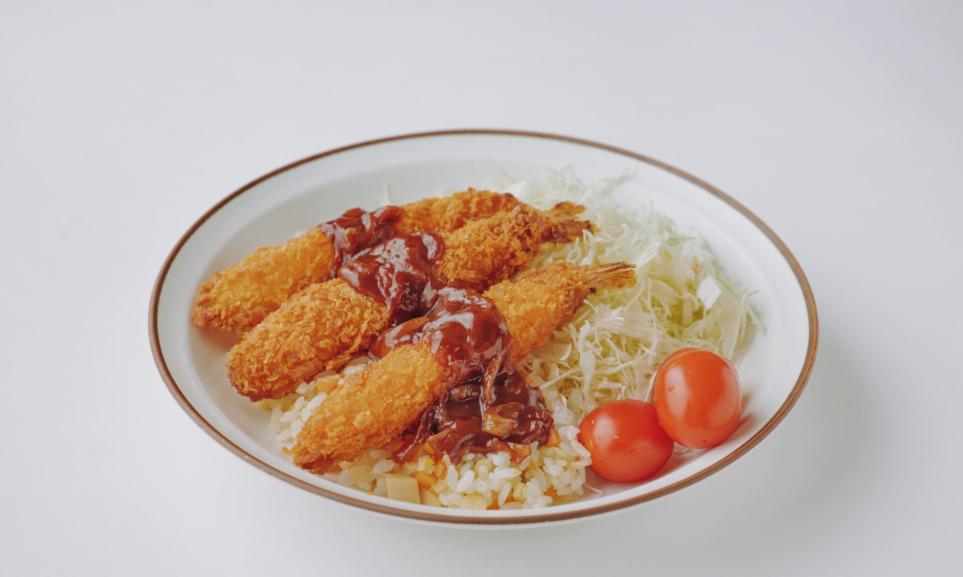 トンカツをのせた通常の「エスカロップ」も提供されていますが、こちらはエビフライ! こだわりは、ソースはタマネギを根気よく、じっくり炒めて甘さを引き出し、バターと赤ワインでコクをプラス。バターライスにはタケノコとニンジンを入れ、食感と彩りをアップさせています。