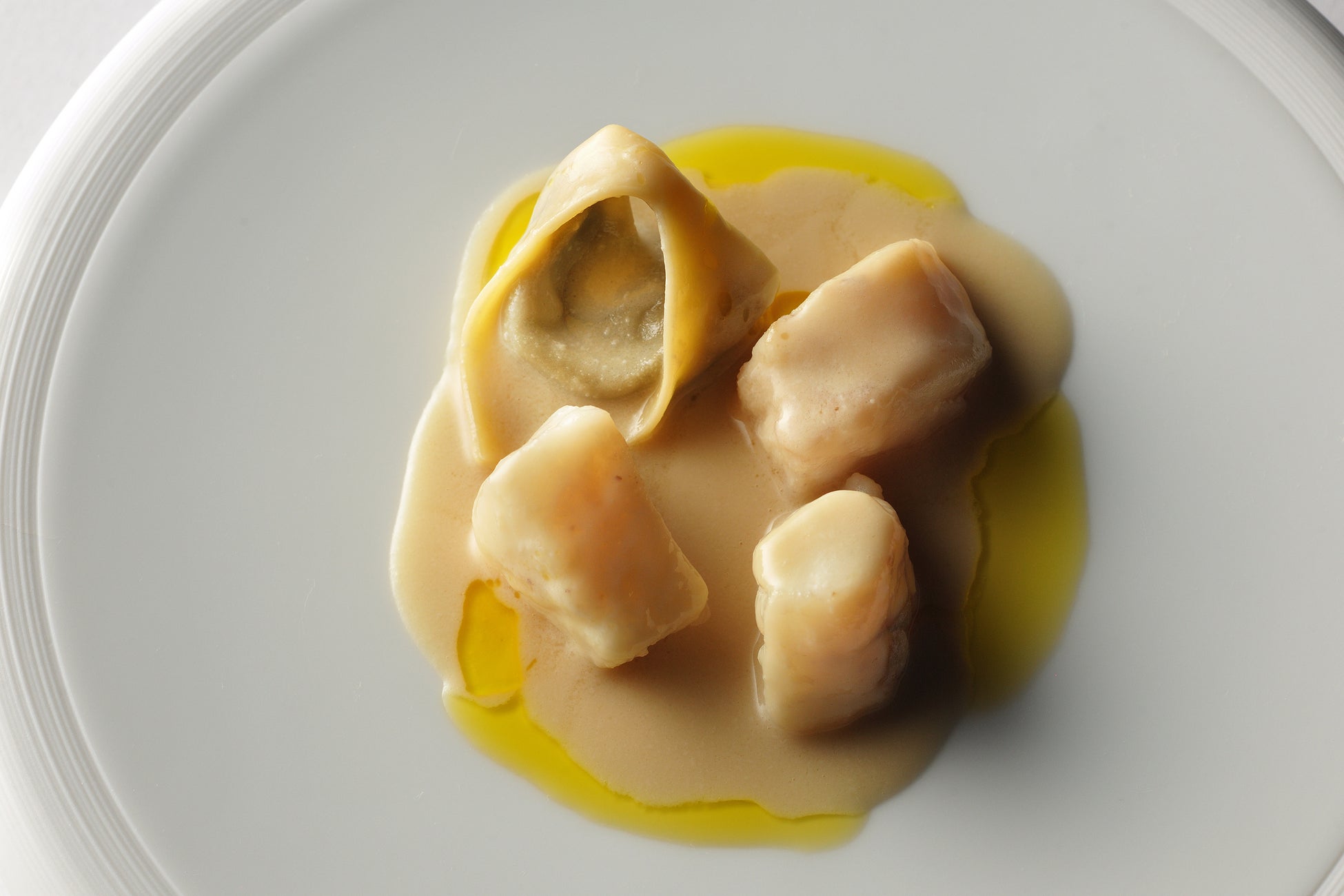 旬を迎える鱈を余すことなく味わえる一皿です。フランスのブランケット(*1)をモチーフに、濃厚な白子を贅沢に使用し、青森県津軽地方に伝わる郷土料理「じゃっぱ汁」を再構築しました。鱈のしっとりとした食感に、ラビオリに隠れたトリュフソースの芳醇な香りがアクセントを添えます。白子のまろやかなコクが口いっぱいに広がる、冬の青森ならではの贅沢な一皿です。