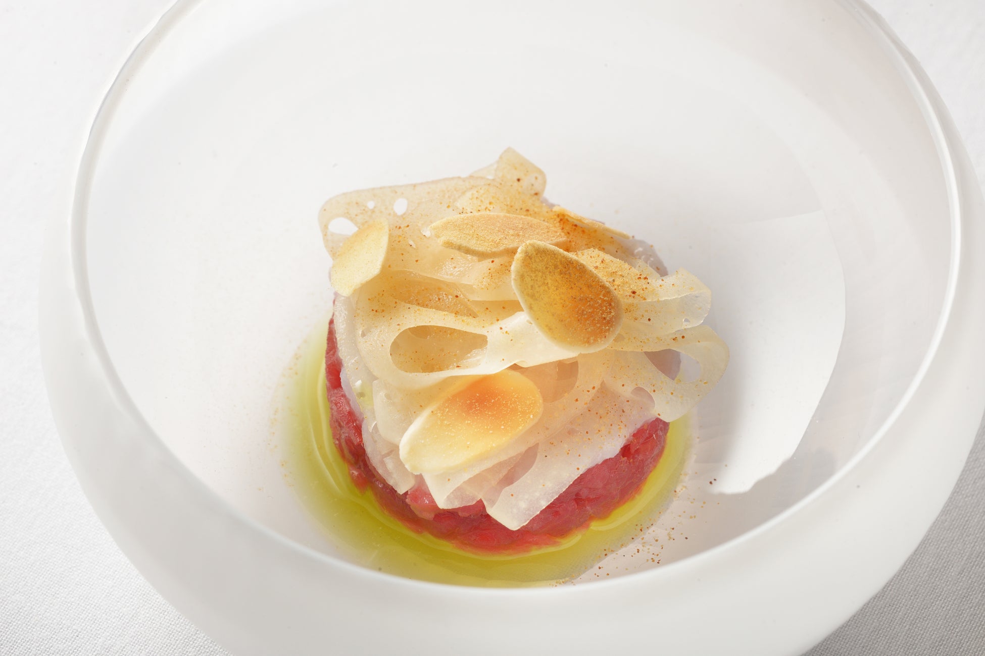 冬の脂が乗った鮪を主役にした一皿です。鮪の甘みを一層引き立てる炭火の香ばしさと魚醤の濃厚な味わいが口いっぱいに広がります。食感のコントラストが楽しい蓮根のピクルスが、鮪本来の旨味をさらに際立たせます。仕上げの鮪節や韮オイルの芳醇な香りが余韻を引き立て、鮪の旨味を最後まで存分に楽しめます。