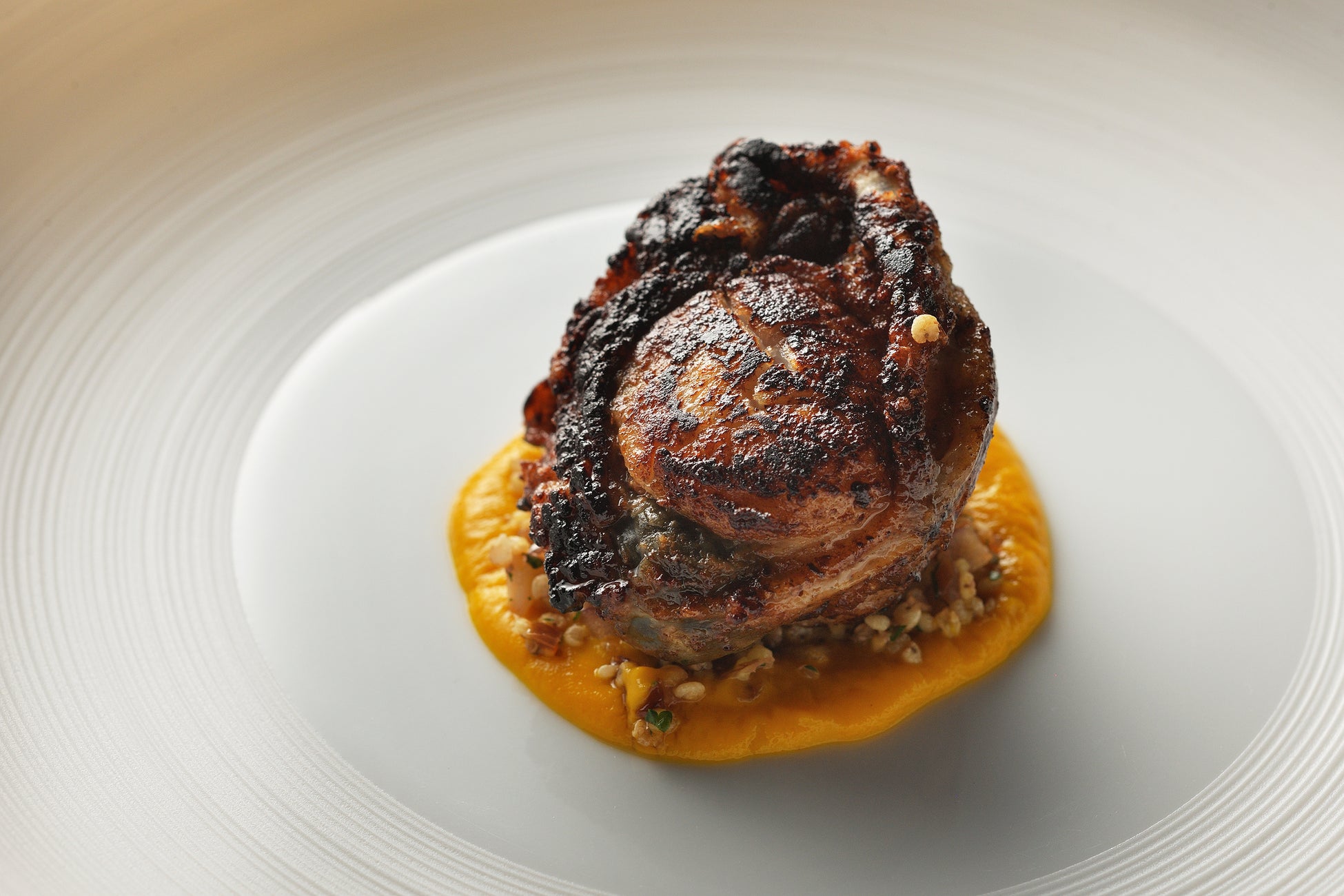 三方を海に囲まれた青森ならではの、帆立貝をひもごと丸ごと堪能できる料理です。香ばしく焼き上げられた帆立貝は、サクッとした食感が心地よく、濃厚で上品な甘みが噛むたびに口の中に広がります。青森の雑穀栽培から着想を得たビリヤニ(*2)と爽やかな酸味をまとった人参のピュレが帆立貝の力強い味わいを引き立てます。地域で親しまれる海の幸を味わいながらも、どこか新しさを感じさせる一皿です。
