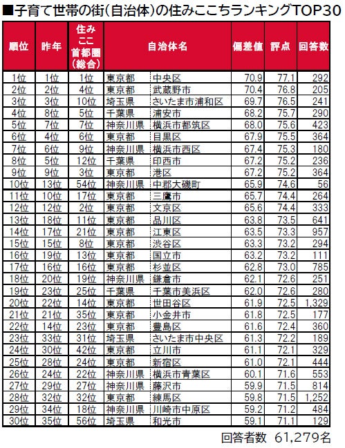 1位は4年連続で東京都中央区で、「住みここち<首都圏版>」でも1位の高い評価を得ています。2位は、2年連続で東京都武蔵野市です。3位は、3年連続で埼玉県さいたま市浦和区です。トップ10内では、神奈川県中郡大磯町が昨年13位から順位を上げて10位となっています。神奈川県中郡大磯町は、「住みここち<首都圏版>」では54位ですが、子育て世帯からの評価は高くなっています。