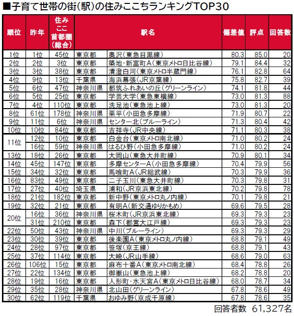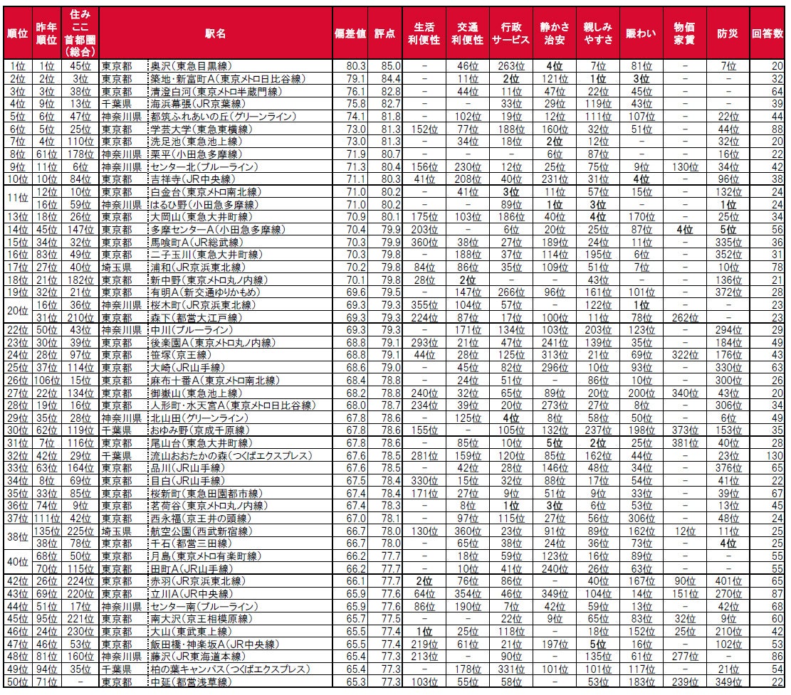 1位は、3年連続で東京都世田谷区に位置する奥沢で、唯一偏差値80台の極めて高い評価を得ています。2位は、4年連続で築地・新富町A(築地・東銀座・築地市場・新富町を統合)で、「住みここち<首都圏版>」では3位となっています。3位は、3年連続で東京都江東区に位置する清澄白河です。トップ10内では、神奈川県川崎市麻生区に位置する栗平が昨年61位から大きく順位を上げて8位となっています。