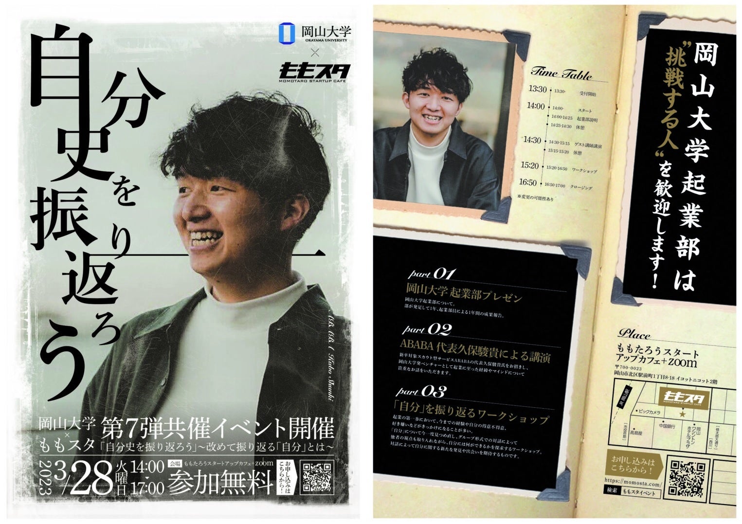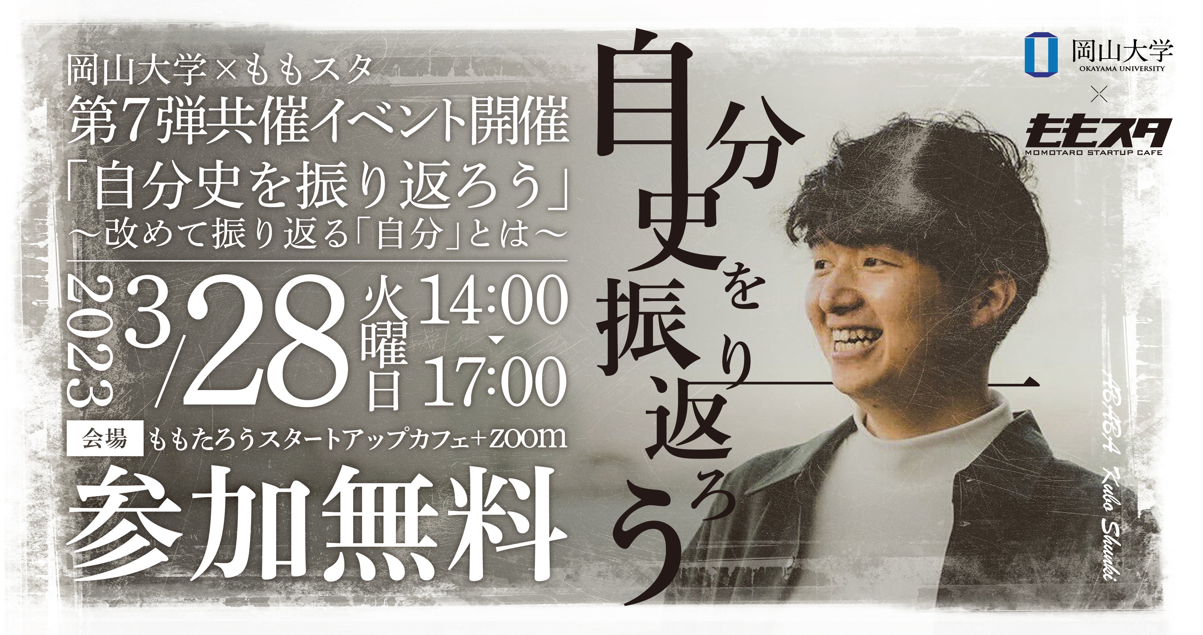 国立大学法人岡山大学(本部:岡山市北区津島中、学長:槇野博史)の岡山大学起業部では、おかやま・スタートアップ支援拠点運営委員会ともに、2023年3月28日(火)に「【岡山大学起業部×ももスタ共催イベント第7弾】「自分史を振り返ろう」~改めて振り返る「自分」とは~」をJR岡山駅前のももたろう・スタートアップカフェ(岡山市北区)とオンライン(zoom)のハイブリッドで開催します。