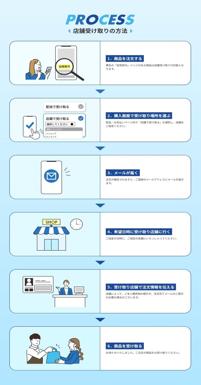 ・ご注文時に決済が完了しておりますので、店頭ではご本人の確認だけでスムーズに商品を受け取る ことが可能です。