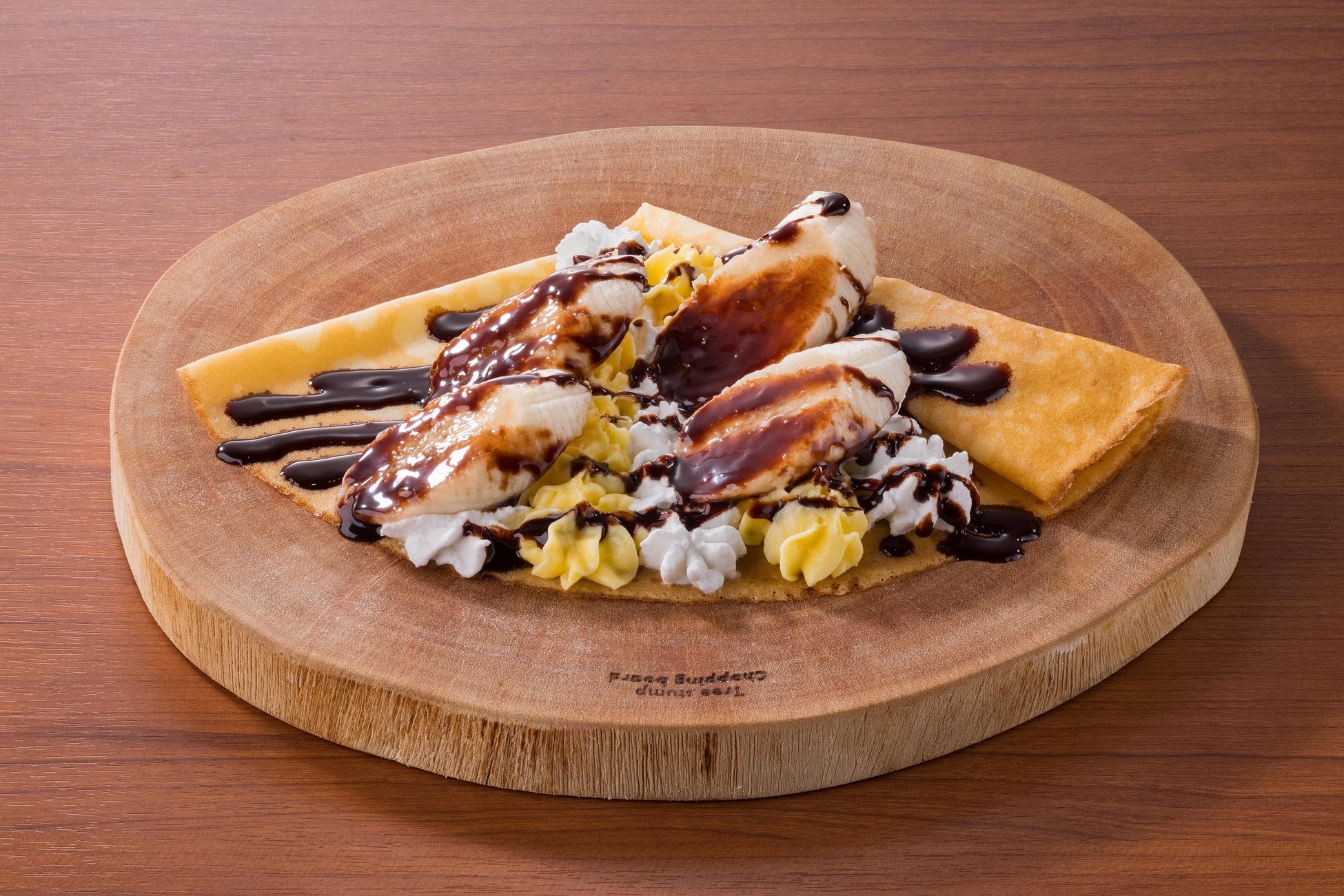 ホイップクリームクリームにチョコソースとバナナを合わせたクレープ。「GURUNAVI FOODHALL WYE」としてクレープの提供は初。約20種類のクレープメニューが揃います。