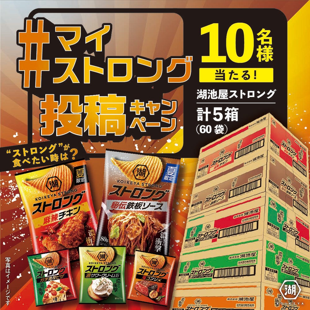 夏限定の新商品2品も登場し、ますます勢いに乗る「湖池屋ストロング」ですが、実際にお召し上がりいただいているみなさまの感想やご意見を聞かせていただきたいとの想いから、コメント投稿型のキャンペーンを実施します。「#マイストロング」をつけて“「湖池屋ストロング」が食べたい時”を教えていただくと、抽選で10名様に、「湖池屋ストロング」(5種類)を箱でまるごとプレゼントします。ガツンと60袋が当たるこのキャンペーンに、ぜひご応募ください。写真つきの投稿も大歓迎です!