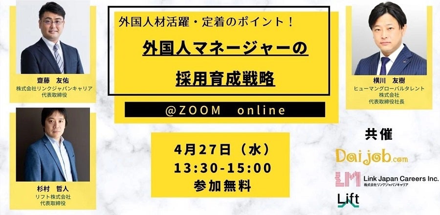 ビジネス・プロフェッショナル×バイリンガルのための転職・求人情報サイト「Daijob.com」を展開するヒューマングローバルタレント株式会社(本社:東京都新宿区、以下「当社」)の代表取締役・横川友樹は、2022年4月27日(水)に無料ウェビナー「外国人マネージャーの採用育成戦略」に登壇いたします。