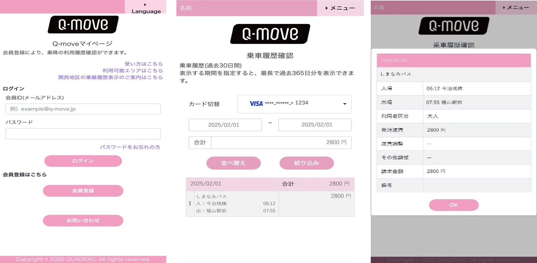 QUADRACのQ-moveサイト(https://q-move.info/)にアクセスし、マイページの会員登録手続きが完了しますと確認可能です。