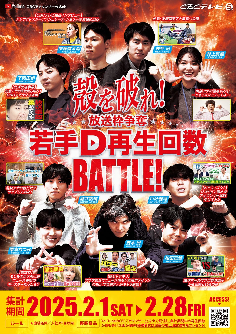 CBCテレビは、2025年2月1日(土)午後8時より、若手クリエイターが企画・制作した新たなコンテンツをCBCアナウンサー公式YouTubeチャンネル「みてちょてれび」で配信開始します。最大の特徴は再生数が最も多かった動画を作成したディレクターが地上波の放送枠を獲得!することです。若手クリエイターたちの柔軟な発想を最大限に活かすことを目的に、あえて制作条件を「CBCアナウンサーを起用すること」のみに設定し、それ以外の内容や形式については、決められた予算内であればすべて自由としました。CBCテレビ入社3年目までの若手クリエイターがフルスイングした結果、クリエイターたちの斬新なアイデアが反映された多彩なコンテンツとなりました。さらに、CBCアナウンサーの新たな一面が見られる企画にもなっています。
