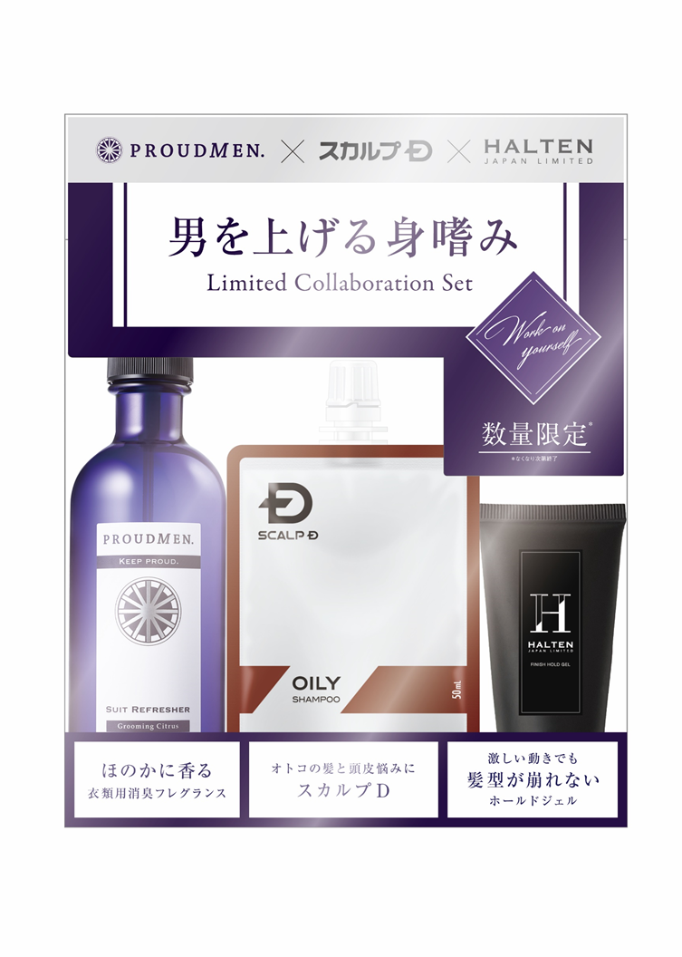 3社のスペシャルコラボレーションセット。PROUDMEN.のスーツリフレッシャーに、スカルプDのスカルプシャンプーとHALTENのヘアジェルがセットに。