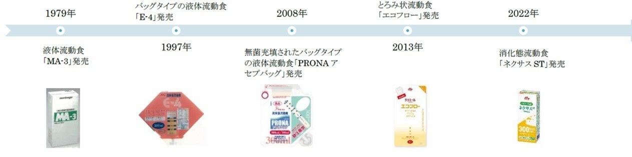 当社は、1979年に国立がんセンター医師との共同研究・開発により「MA-3」という紙パック入り液体流動食を発売以降、医療・介護従事者の皆さまや患者さまのお声に寄り添い、1997年には、バッグタイプの液体流動食「E-4」発売、2008年にMOAS(Morinaga Original Aseptic System)による無菌充填されたバッグタイプの液体流動食「PRONAアセプバッグ」発売、2013年にとろみ状流動食「エコフロー」発売、2022年には消化態流動食「ネクサスST」発売と、栄養成分はもちろんのこと、容器形態や粘度、使用用途に応じた商品を開発・発売してまいりました。