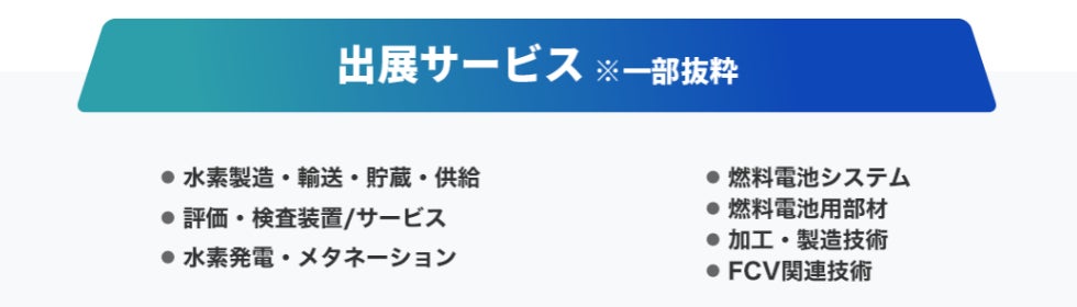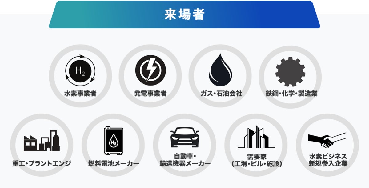 来場者の例:水素事業者、発電事業者、ガス・石油会社、鉄鋼・化学・製造業、重工・プラントエンジ、燃料電池メーカー、自動車・輸送機器メーカー、需要家(工場・ビル・施設)、水素ビジネス新規参入企業 ・・他