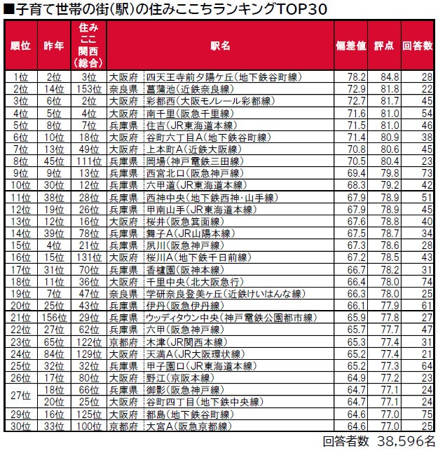 ●トップ10のうち、「住みここち<関西版>」でもトップ10に入っている駅は4駅のみで、その他の駅は2桁、もしくは3桁の順位でした。「住みここち<関西版>」は全世帯が対象ですが、子育て世帯にとっての住みここちは、少し異なる結果となっています。