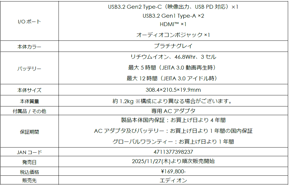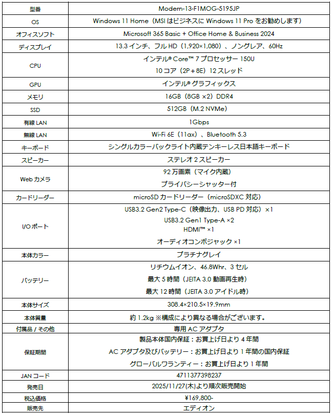 この度、エムエスアイコンピュータージャパン株式会社は、携帯性とパフォーマンスを両立したスタンダードノートPCの13.3インチモデル「Modern 13 F1M」シリーズより、エディオンオリジナルモデル「e angle select」として展開する「Modern-13-F1MOG-5195JP」を2025年11月20日(木)より発売いたします。