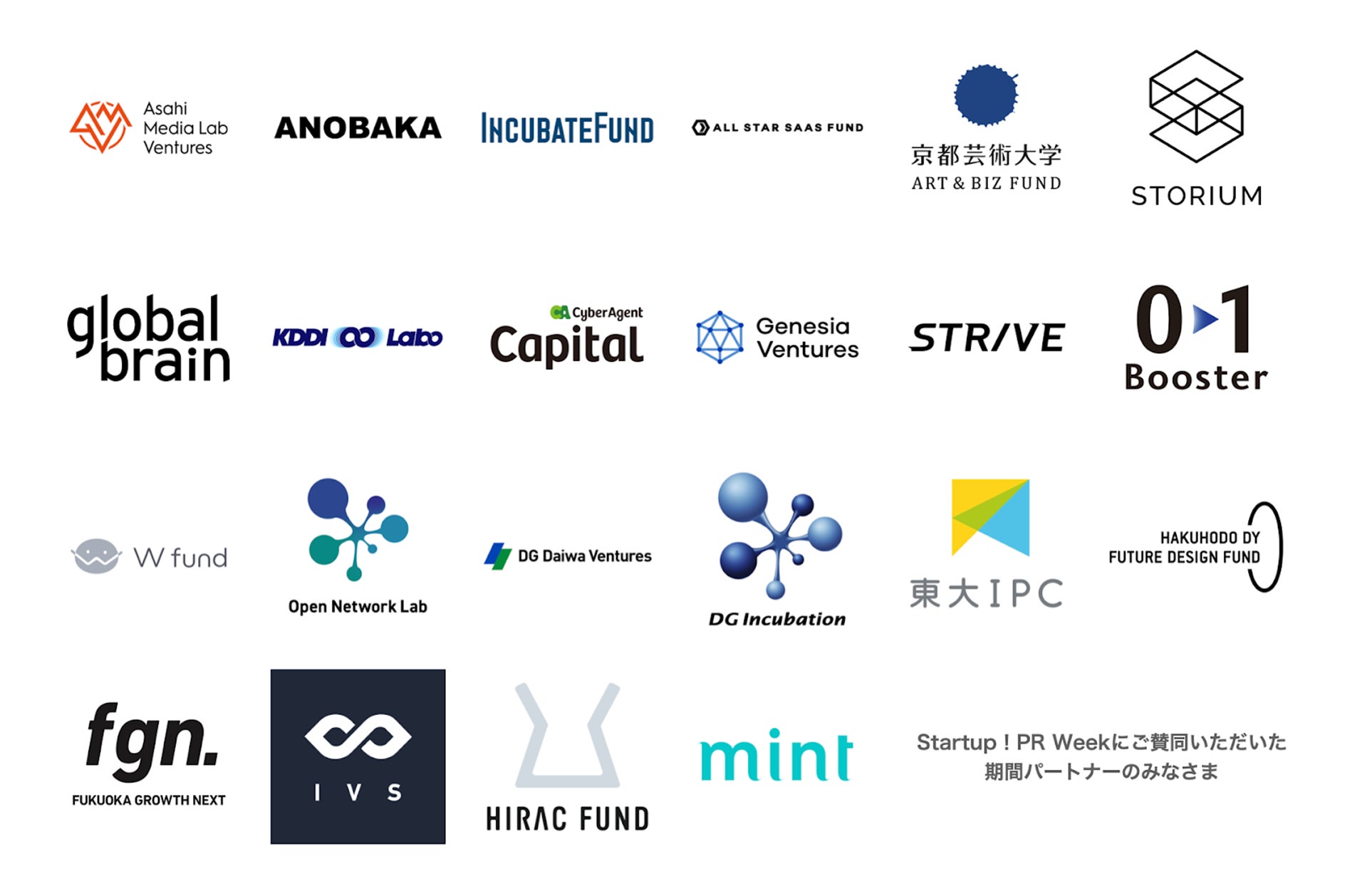 朝日メディアラボベンチャーズ、株式会社ANOBAKA、インキュベイトファンド株式会社、ALL STAR SAAS FUND(*2)、株式会社クロステック・マネジメント(京都芸術大学 Art & Biz ファンド)、株式会社グランストーリー(STORIUM)、グローバル・ブレイン株式会社、KDDI株式会社(KDDI ∞ Labo)、株式会社サイバーエージェント・キャピタル、株式会社ジェネシア・ベンチャーズ、STRIVE株式会社、株式会社ゼロワンブースター、W株式会社、株式会社デジタルガレージ(Open Network Lab)、株式会社 DG Daiwa Ventures、株式会社 DGインキュベーション、東京大学協創プラットフォーム開発株式会社(東大IPC)、株式会社博報堂DYベンチャーズ、Fukuoka Growth Next(*2)、Headline Asia(*2)、マネーフォワードベンチャーパートナーズ株式会社(HIRAC FUND)、mint(*2)