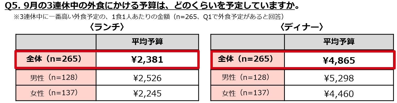 ・外食の平均予算は、ランチが2,381円、ディナーが4,865円で、男性の方がやや高めの傾向。