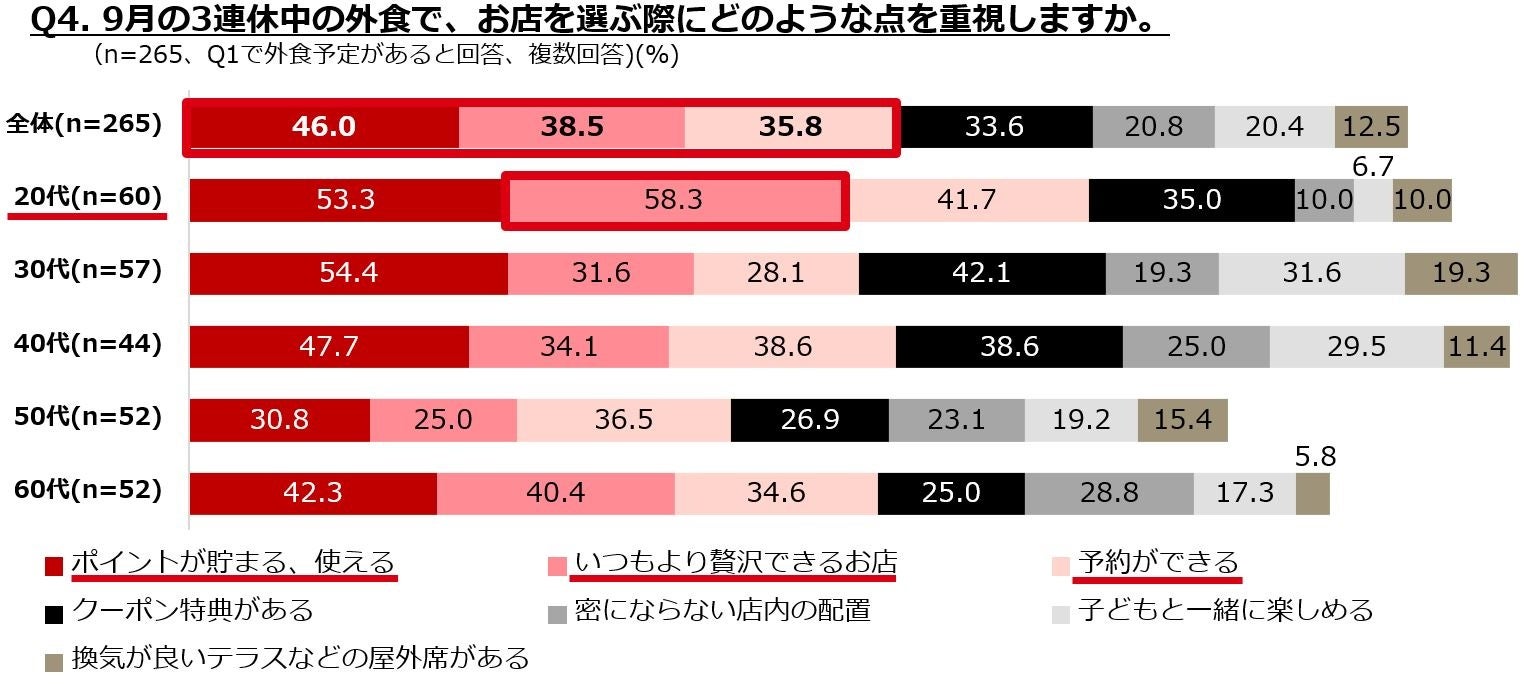 同率1位となった「外食」について1食1人当たりの平均予算を見るとランチが2,381円、ディナーが4,865円と、昨年のシルバーウィーク調査(※)と比べるとやや低めの結果となりましたが、3連休の外食でのお店選びで重視する点をたずねると、「ポイントが貯まる、使える」に次いで、「いつもより贅沢できるお店」が約4割。昨今の物価高の影響か、かけられる予算が控えめになっても、「外食」でいつもと違う「特別な体験」をしたいと考えていることがうかがえました。