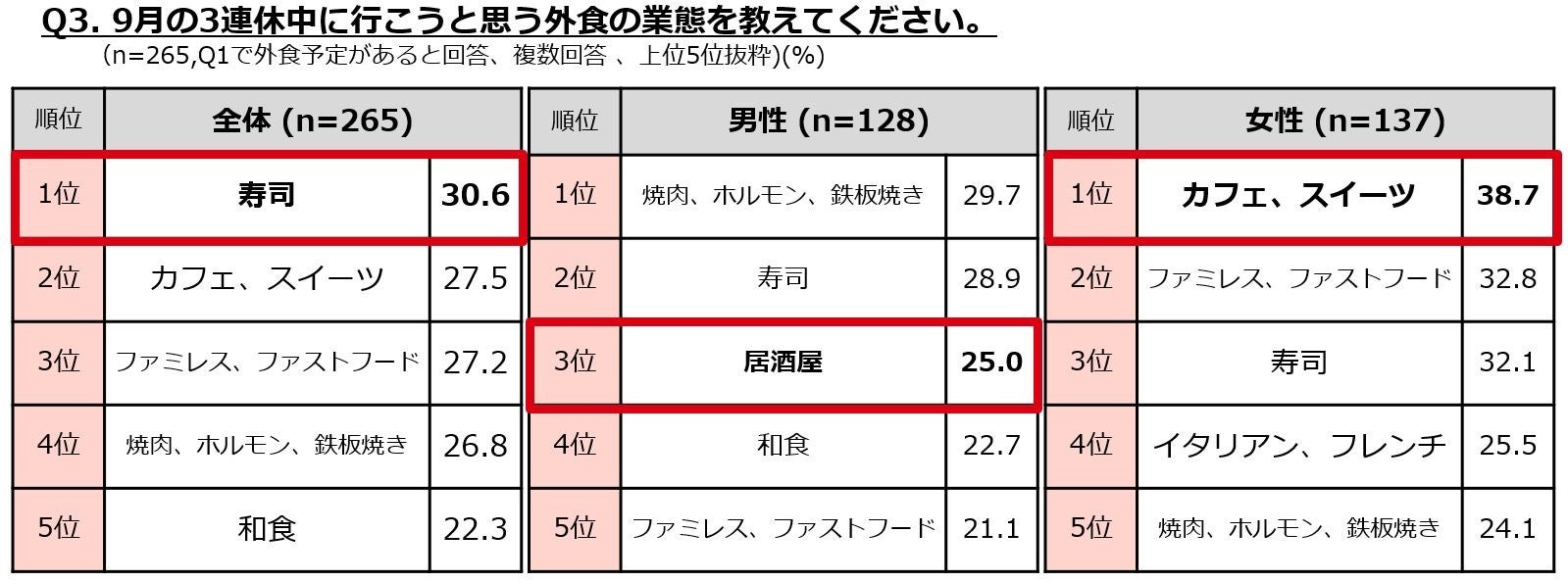 また、3連休中に行きたい外食の業態を尋ねると、女性では「カフェ・スイーツ」が1位となりました。秋の味覚、栗やサツマイモ、ブドウなどで「食欲の秋」ならぬ「スイーツの秋」を楽しむ予定なのかもしれません。