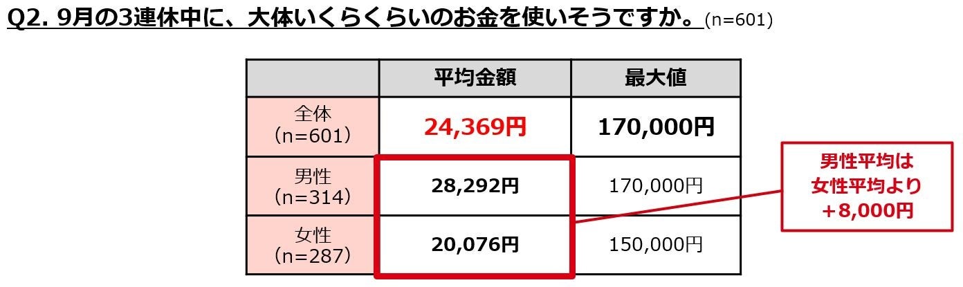 ・連休の平均予算は24,369円。男女で8,000円ほどの差。
