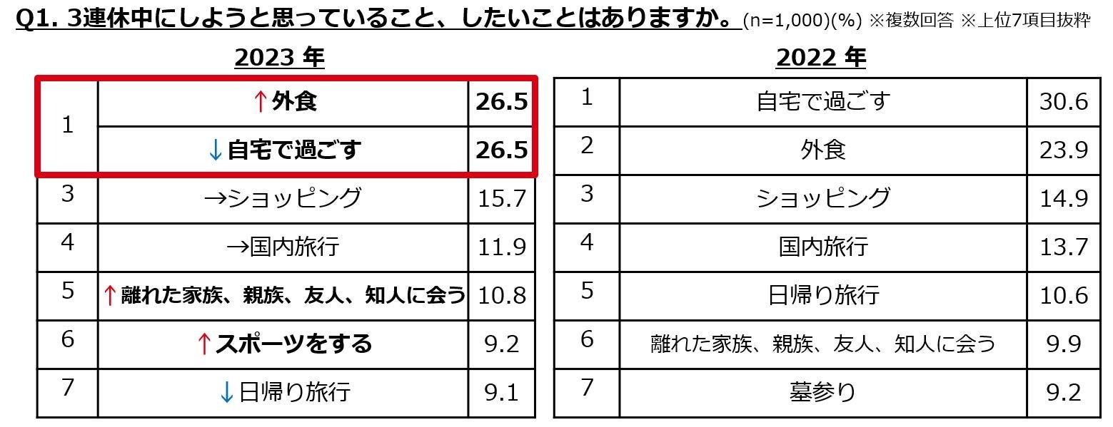 ・3連休予定は「外食」、「自宅で過ごす」が同率でトップ。「自宅で過ごす」は昨年より4pt下がる。