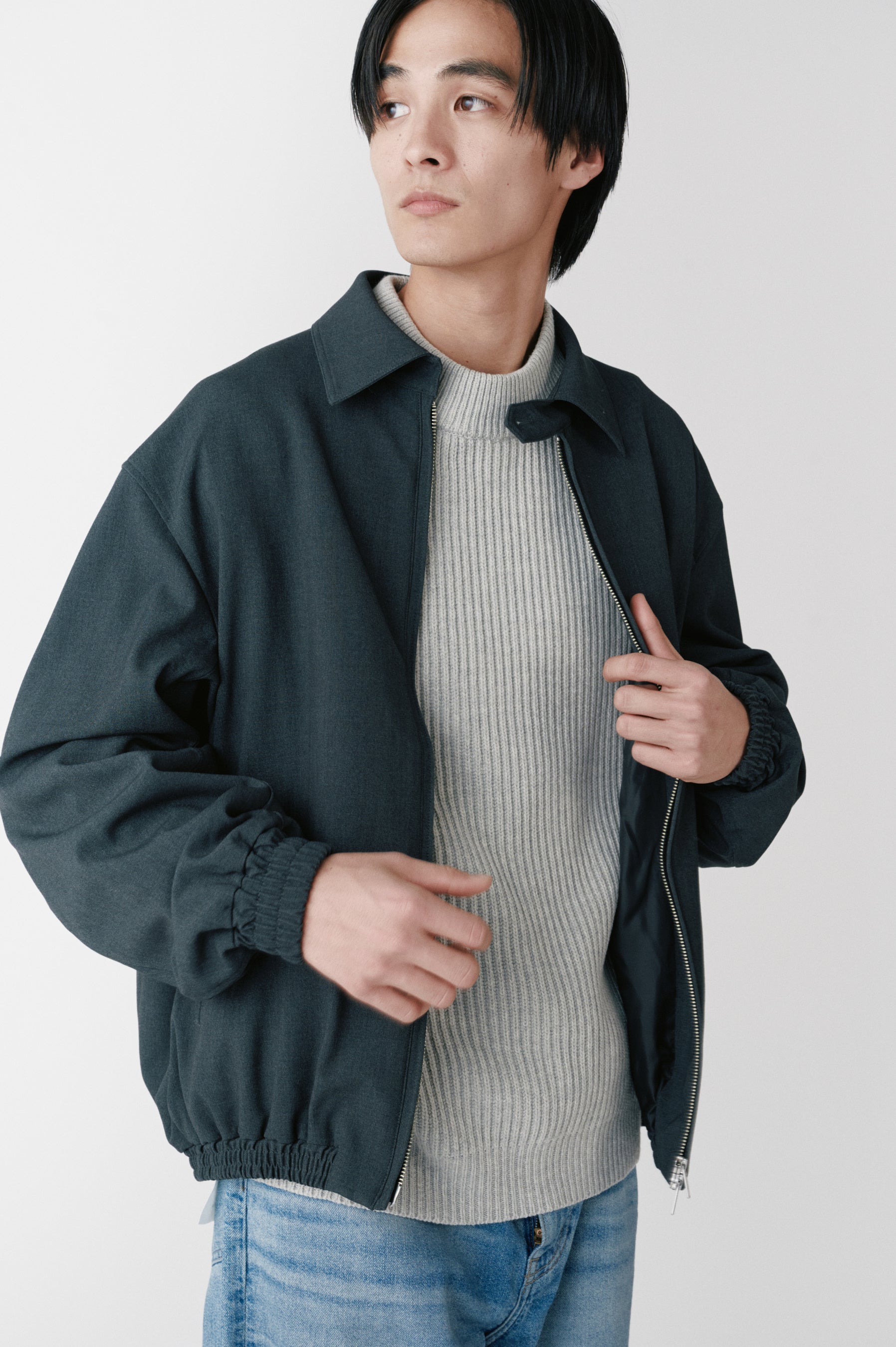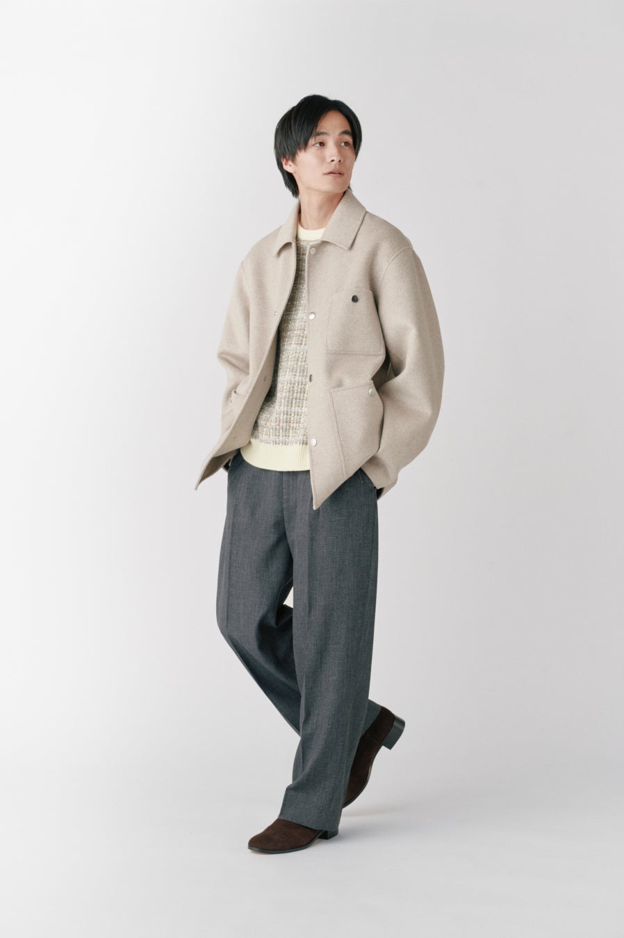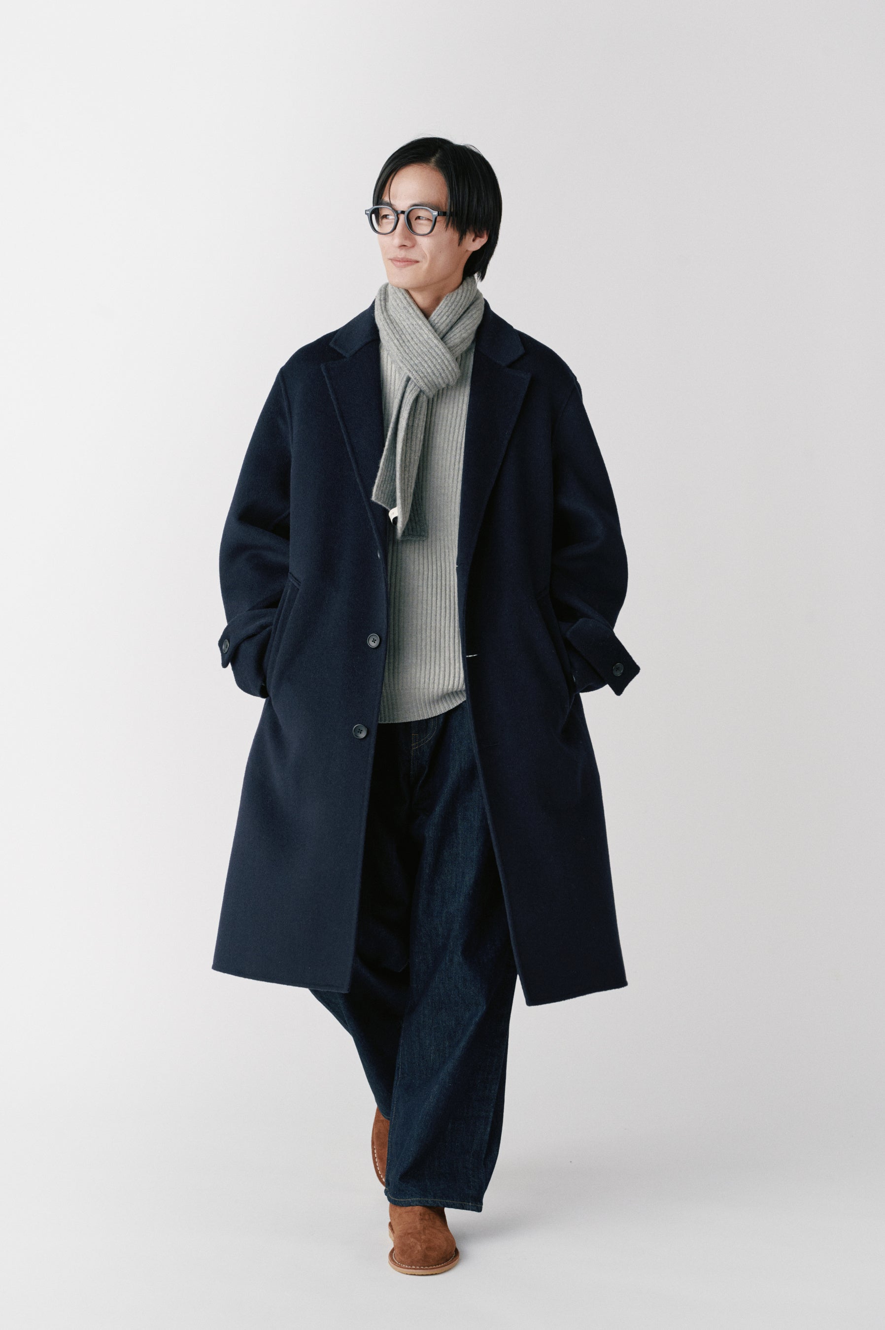 ウールリバーコートを主役に、全体を淡いトーンでまとめた冬のコーディネート。重くなりがちな季節だからこそ、柔らかな色合いが上品さと抜け感を演出。上質な素材感が際立ち、シンプルながらも大人の余裕を感じさせるスタイルに。冬の日常から特別なシーンまで、自然体で映える一着。