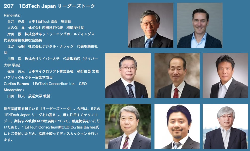 例年高評価を得ている「リーダーズトーク」。今回は、6名の1EdTech Japan リーダをお迎えし、最も注目するテクノロジー、期待する教育DXの新展開について、話題提供をいただいたあと、1EdTech Consortium新CEO Curtiss Barnes氏にもご参加いただき、話題を絞ってディスカッションを行います。