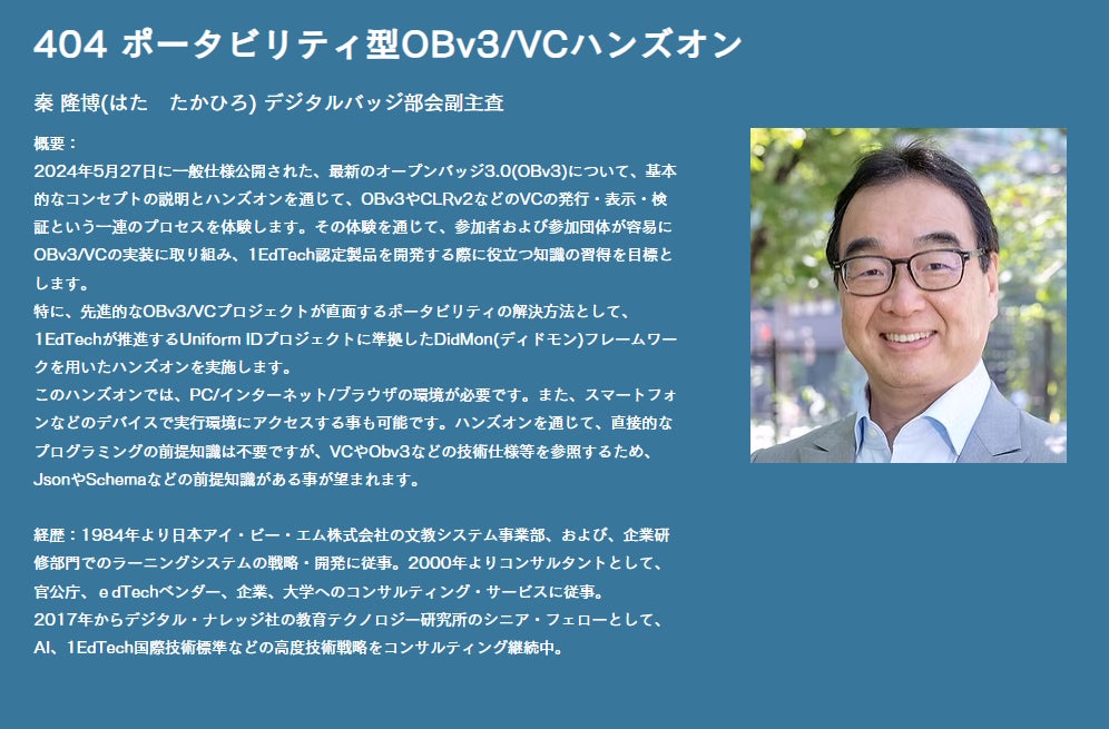 当社からは、7月31日(木)の「1EdTech Japan リーダーズトーク」に代表取締役社長 はが 弘明が登壇。また、8月2日(土)の「日本1EdTech協会の技術実践」には、デジタル・ナレッジ教育テクノロジ研究所 シニア・フェロー 秦 隆博(一般社団法人日本1EdTech協会 デジタルバッジ関連標準国内導入検討部会 副主査)が登壇いたします。