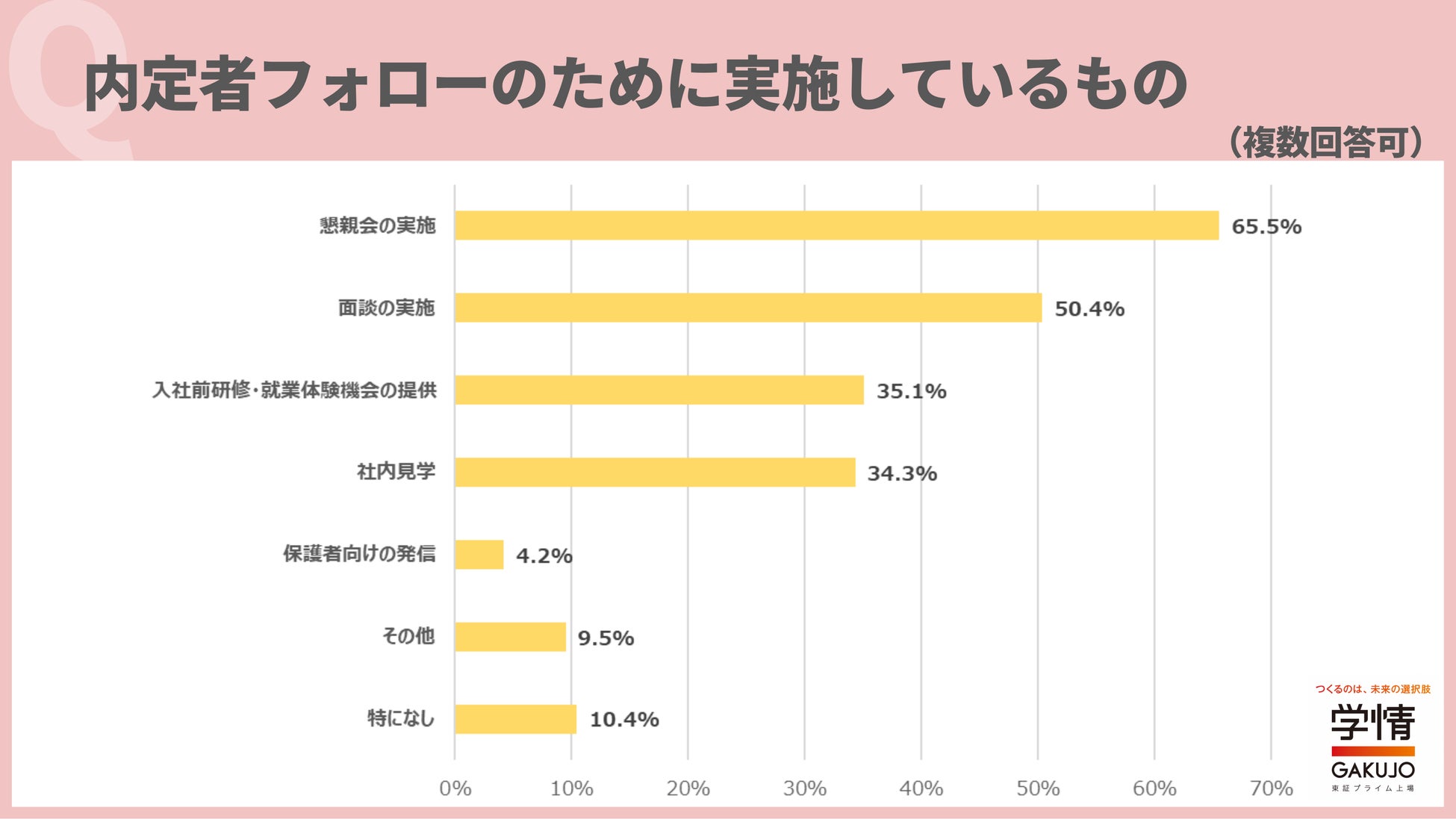 内定者フォローのために実施しているものは、「懇親会の実施」が65.5%で最多。次いで、「面談の実施」50.4%、「入社前研修・就業体験機会の提供」35.1%、「社内見学」34.3%が続きました。「定期的なコミュニケーションをとり、内定辞退を防ぎたい」「月に1度、飲食をしながら参加できるオンラインでの懇親会を実施している」「可能な限り様々な情報や機会を提供し、理解を深めてもらうことでミスマッチを防ぎたい」などの声が上がりました。