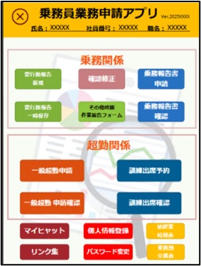 乗務員が業務報告や時間外勤務の申請をスムーズに行えるアプリ。申請者は承認状況をリアルタイムで確認でき、タブレット端末を活用することで、場所や時間にとらわれない柔軟な業務運用を実現している。