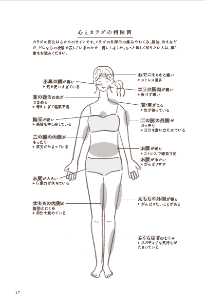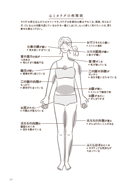 ほかにも下のイラストのように、顔、首、肩、二の腕、胸元、お腹、ふくらはぎの部位ごとに、あなたのメンタルがわかります。本書では、カラダと心の関係の説明とともに、なぜカラダの特定の部位に、自分の心理状態が反映されるのかについて説明しています。