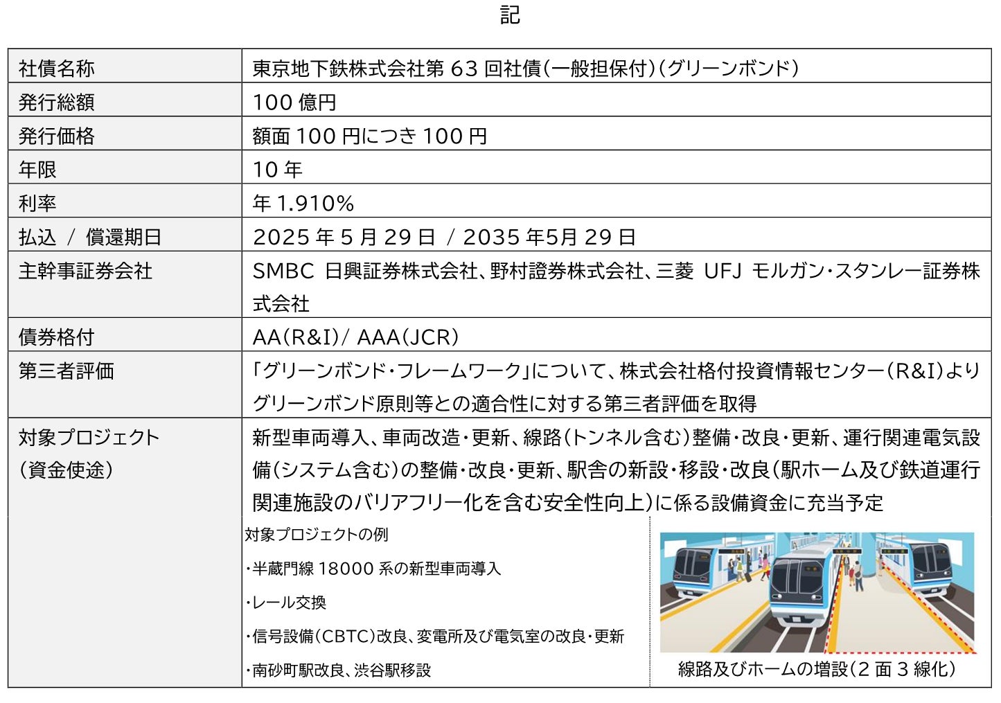 東京地下鉄株式会社(本社:東京都台東区、代表取締役社長:山村 明義、以下「東京メトロ」)は、環境問題の解決に資する施策に充当する資金の調達手段として、「グリーンボンド」の発行条件を本日決定いたしました。