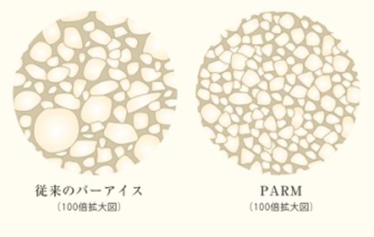 アイスは凍結に時間をかけるほど組織の粒子は大きくなり、なめらかさが失われてしまいます。「PARM」はアイスを急速凍結させ、粒子が細かい状態で存在するため、口当たりの良いなめらかなアイスに仕上がります。