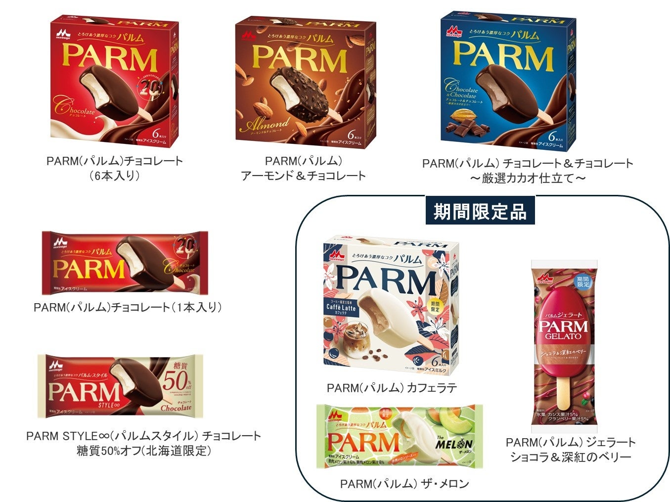 多様化するお客様のニーズに合わせ、新しいシリーズとして、夏限定でジェラート専門店のような本格的な味わいが楽しめるジェラート(2021年~)、コーティングチョコを2層がけにし、スイーツ感をより高めたダブルチョコ(2021年~)、PARM定番のおいしさをそのままに、「糖質50%オフ」※3を実現した「PARM STYLE∞(パルムスタイル)チョコレート 糖質50%オフ」(2024年~)を発売(北海道限定)。技術面でも挑戦を重ね、幅広い楽しみ方を提案しています。