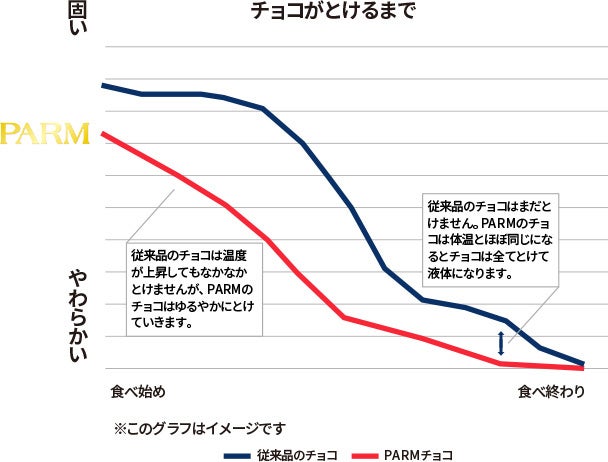 一般的なチョコレートアイスバーは、チョコがパリパリしており、食べる時にはがれ落ちたり、口の中でアイスが先に溶けチョコが残ることがあります。「PARM」のチョコは、体温と同じ温度で液状になるように融点をコントロールしており、口に含むとアイスと溶け合い、またチョコがはがれにくいため、最後までチョコとアイスを同時に楽しめます。