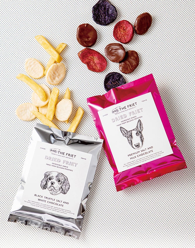 北海道の契約農家が作ったカラフルなポテトのドライフリットと、ヨーロッパ産ポテトのドライフリット。オリジナルフレーバーとチョココーティングの上品な甘辛ミックスを。