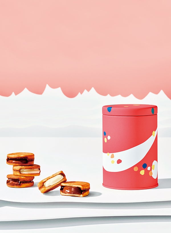 ★「スノーサンド」は、生チョコレートサンドクッキー。なめらかな舌触りの生チョコレートと長年の研究で編み出したカリカリ食感のバター香るラングドシャクッキーの相性抜群!バレンタインでは、特別パッケージで登場!