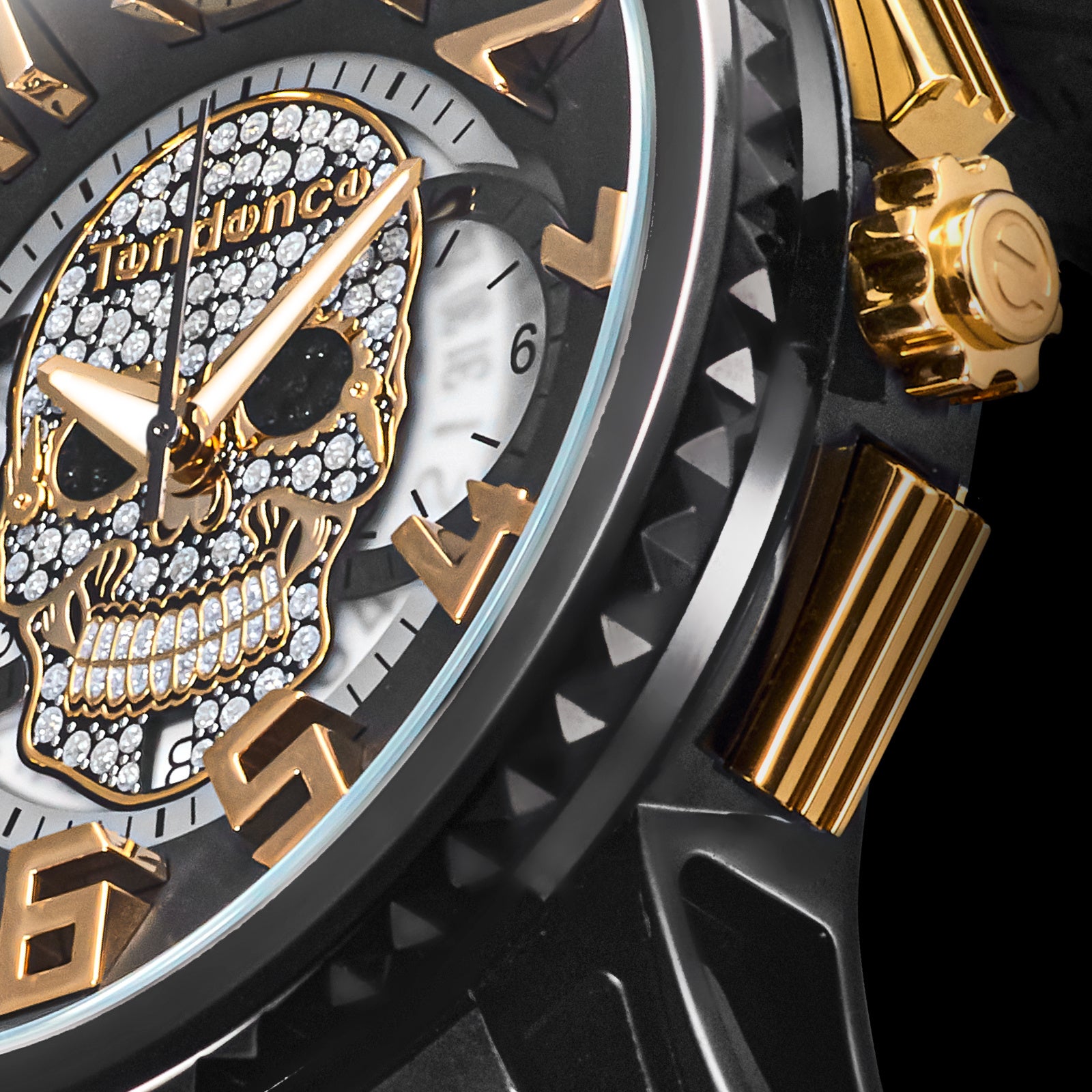 文字盤の中央にラメとスタッズで形成されたテンデンスオリジナルのスカルが煌めく2023年秋の新作『GULLIVER SKULL(ガリバースカル)』。スカルの背面、文字盤の中央はシースルーでカレンダーが透けて見えます。50㎜のケースサイズを誇るテンデンスならではの迫力あるデザインです。