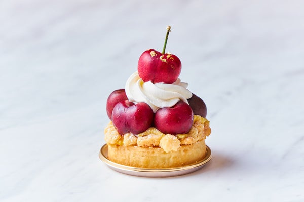 アーモンドタルト生地とサクサク食感が楽しめるクランブルの上に、キルシュの風味豊かなバニラクリームと、クリームシャンティ、アメリカンチェリーを飾りました。みずみずしくハリのある果肉や強い甘みが魅力なアメリカンチェリーを6粒も使用した、6月限定のタルトをお楽しみください。