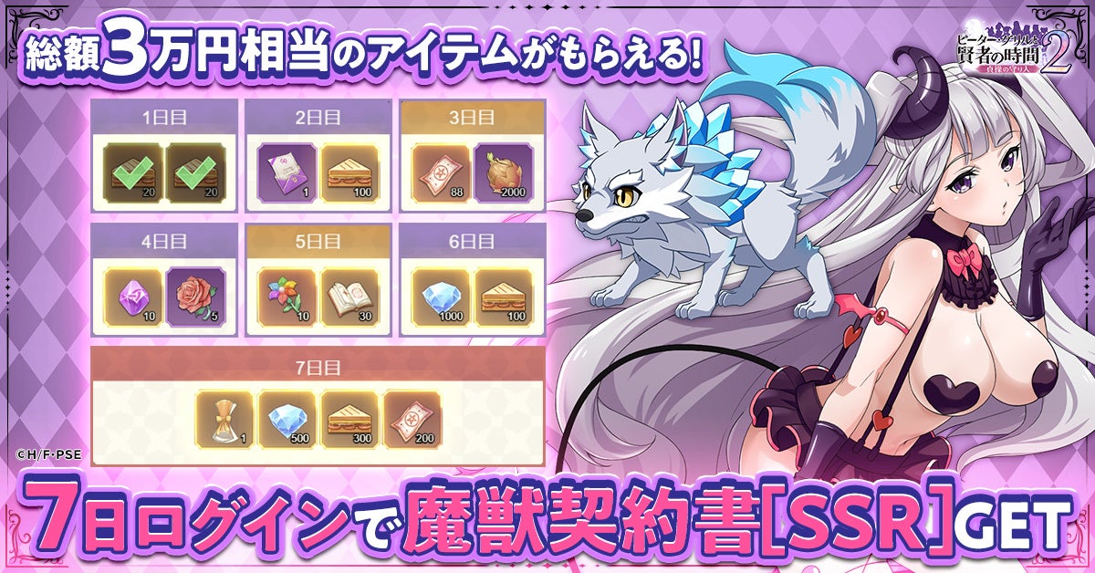 ゲーム開始から7日間、ゲームにログインするだけで総額3万円相当の多様なアイテムを獲得できるイベントを開催します。さらに、7日間ログインするとSSR魔獣が入手できる「魔獣契約書 SSR」がもらえます!