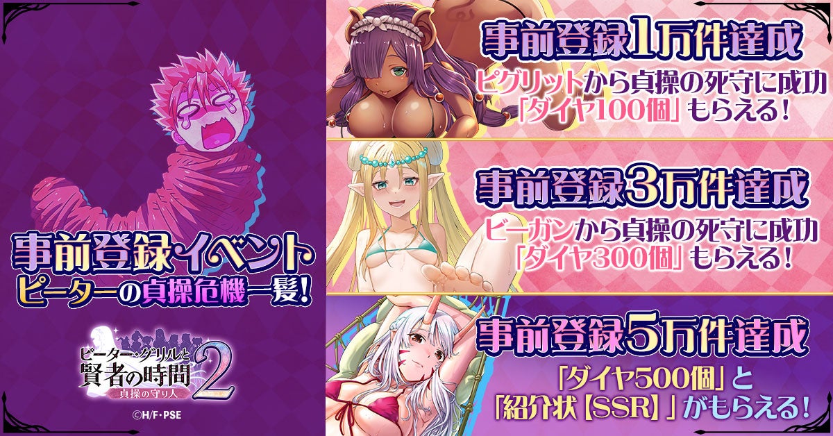 事前登録イベント「ピーターの貞操危機一髪!」にて、見事、事前登録者数を5万件突破いたしました!伴ってもらえる報酬は下記となります。