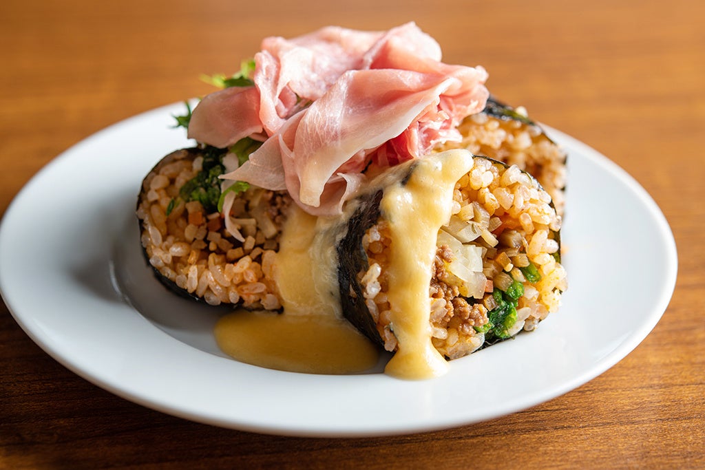 「ラッキーソウル」が、密かに強力なオリジナリティーを発揮しているのが「キンパ」。キンが海苔を、パがご飯を表す、韓国の海苔巻は、日本でも今やすっかりお馴染みの存在となっています。ごま油の風味が、おつまみとしても〆としても存在感を発揮するこのカテゴリに「ラッキーソウル」は3種をラインナップ。寿司ダネでも大人気のねぎとろを使った日本×韓国コラボの決定版 「ねぎとろユッケキンパ(580円)」、甘辛く炒めた牛肉と野菜がご飯と絶妙のマッチングを見せる「プルコギキンパ(580円)」、まさかのイタリアン風!?塩気のある生ハムにとろ〜りチーズが絡み合う「生ハムチーズキンパ(580円)」。思わず全種類制覇したくなる顔ぶれです。