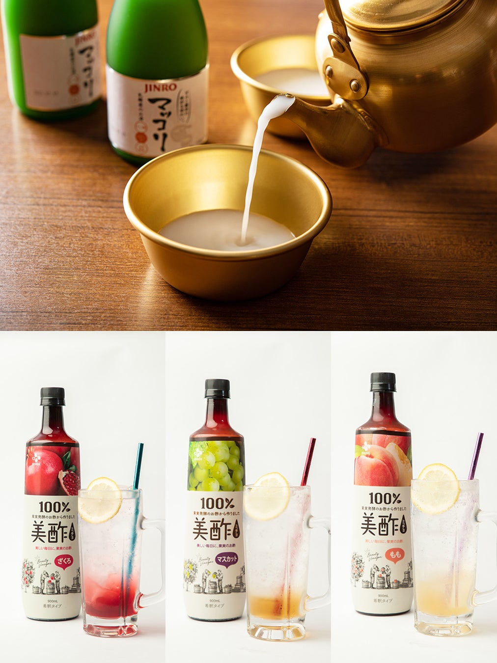 昔から親しまれているマッコリに、韓国ドラマから人気に火がついたチャミスル、美容にもダイエットにも効果的と言われ韓国で人気の「美酢サワー」など、多彩なラインナップで心地よい酔いのひと時を演出します。