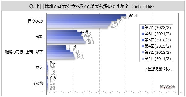 【昼食に関する調査】昼食を食べる人のうち、平日の昼食は「自分ひとり」で食べることが最も多い人は6割。過去調査と比べて増加傾向。「家族」「職場の同僚、上司、部下」と一緒に食べる人は減少傾向
