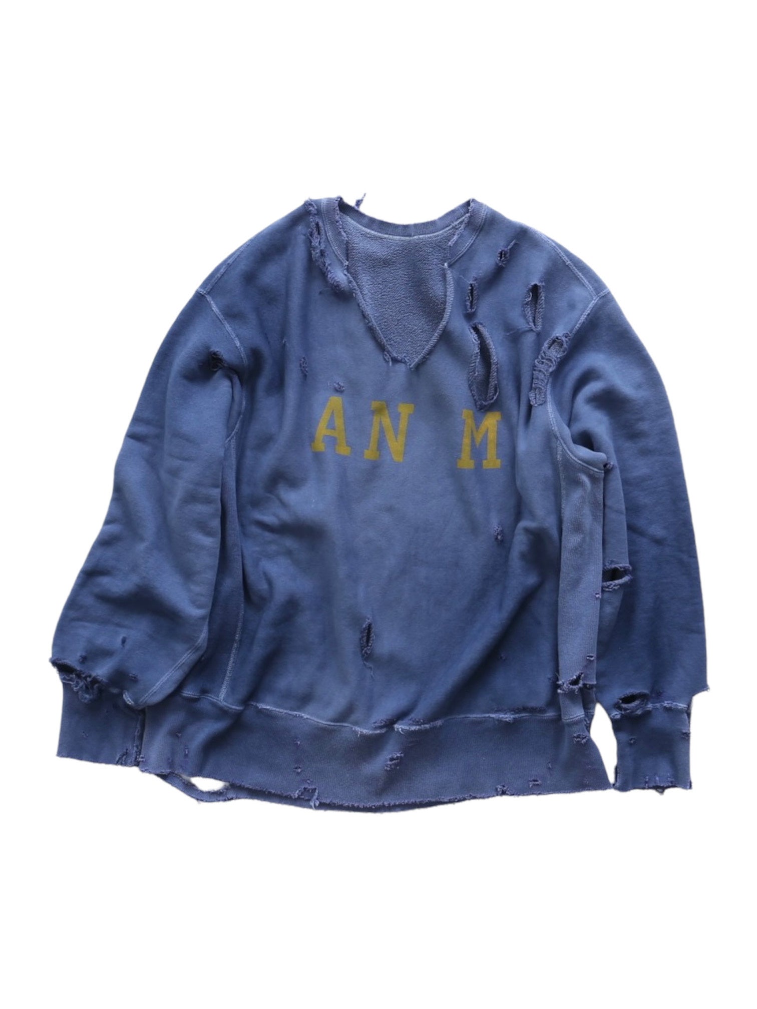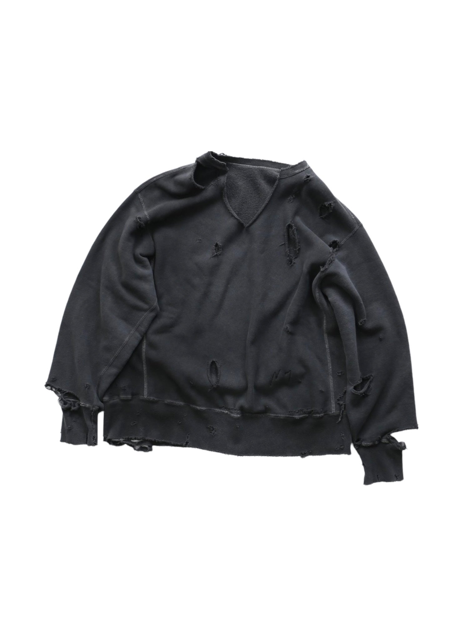 ダメージではなく、クラッシュの領域まで持っていくように職人と全ての穴の箇所をバランスを取り、前見頃のVネックも裁断したのではなく、穴に。