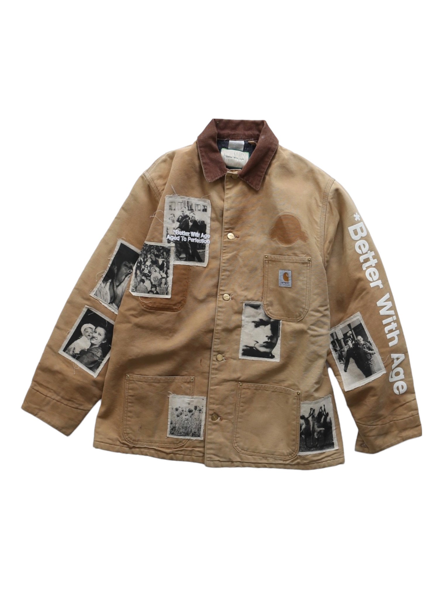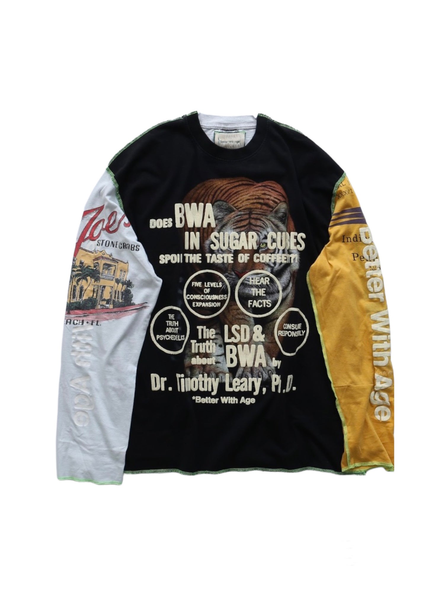 今回仕入れたアイテムは、前、後、左袖、右袖の全てを違う古着で繋ぎ合わせ、そこに全面余すところなくプリントされている。その一発勝負感がたまらない。