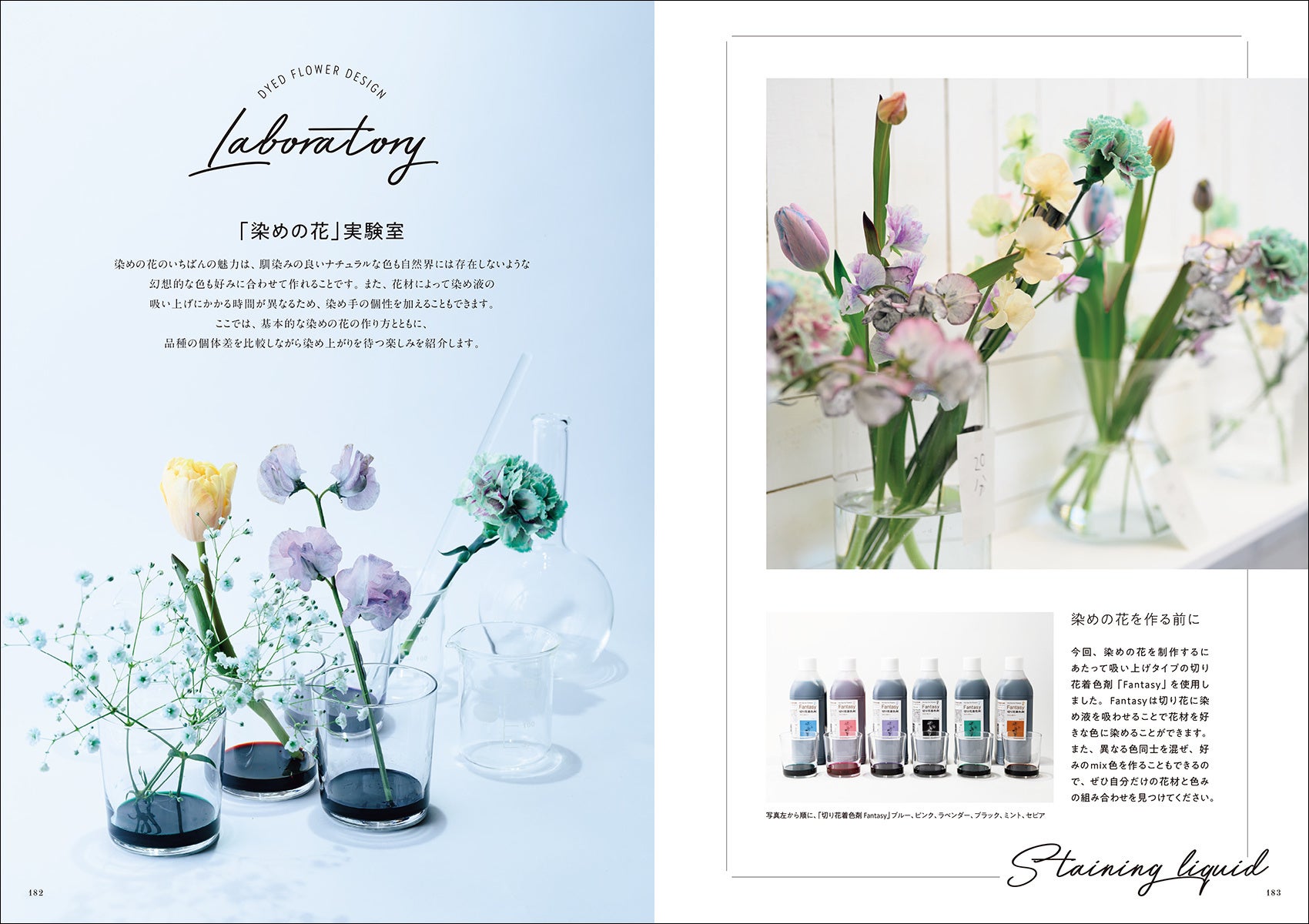 カラフルなものからニュアンスカラーまで、好きな色に染められるうえ、花がもつもともとの色と相まって新たな魅力に気づかせてくれる手法。
